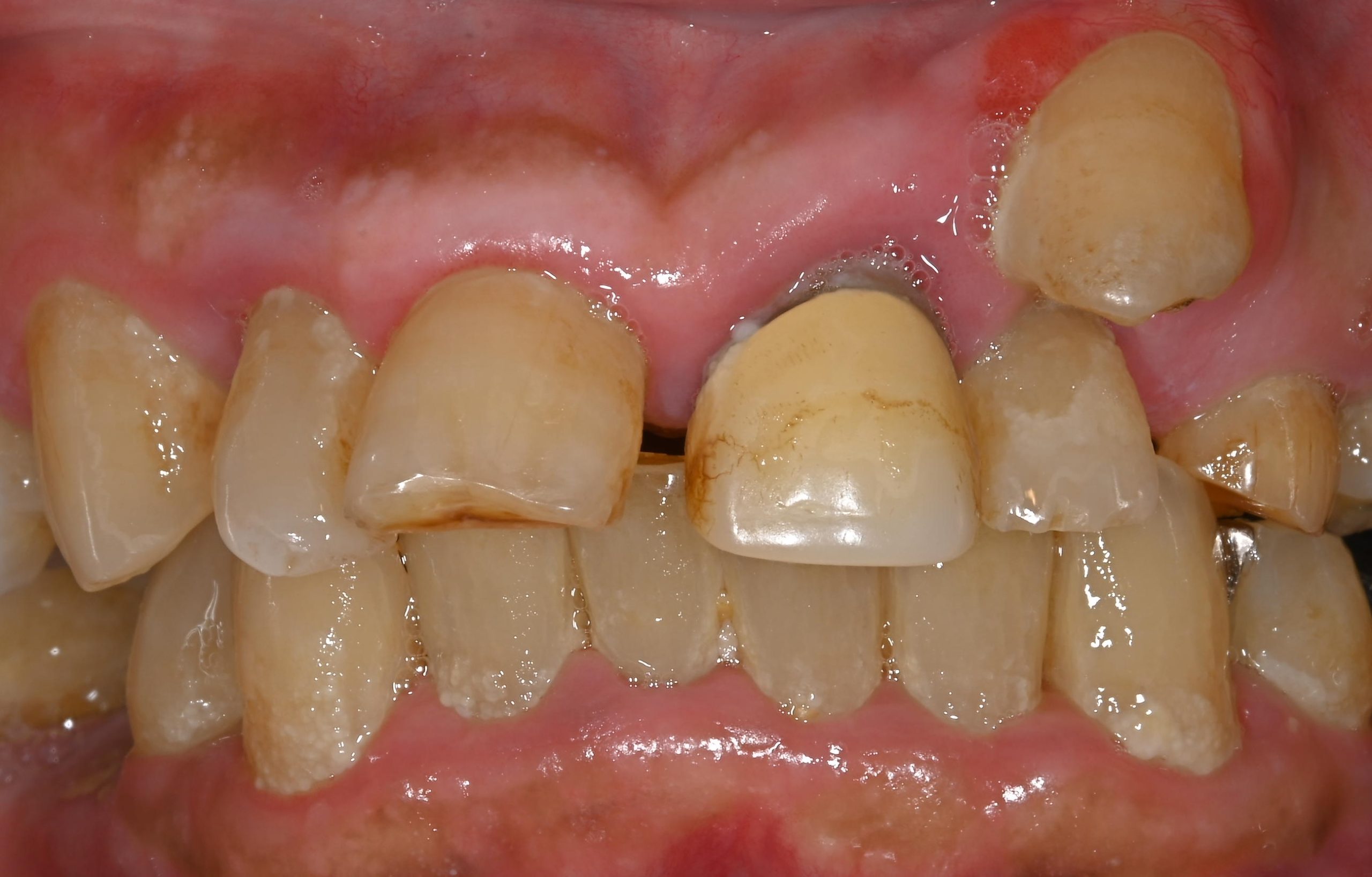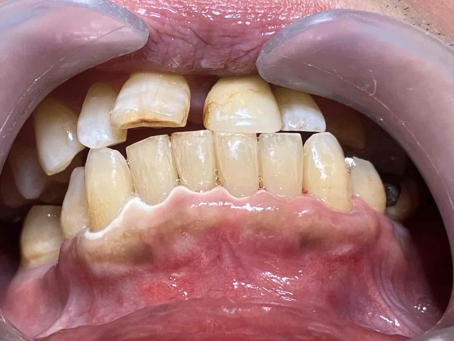 この患者様は、口腔内全体において重度の歯周病が生じており、歯磨き指導、クリーニング、Flap手術等を行ったが、歯周ポケットが深すぎるため