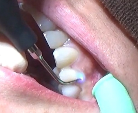 深い歯周ポケットに青いレーザー光と過酸化水素水を照射し、患部を殺菌しています。